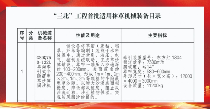 近期,國(guó)家林業(yè)和草原局正式發(fā)布了《“三北”工程首批適用林草機(jī)械裝備》目錄,全國(guó)共計(jì)28個(gè)機(jī)械裝備入選。甘肅建投新能源公司高性能治沙機(jī)械產(chǎn)品GSDQ750-132L單向牽引式半隱蔽型草沙障固沙機(jī)憑借其卓越的性能和創(chuàng)新技術(shù),成功入選目錄榜首。