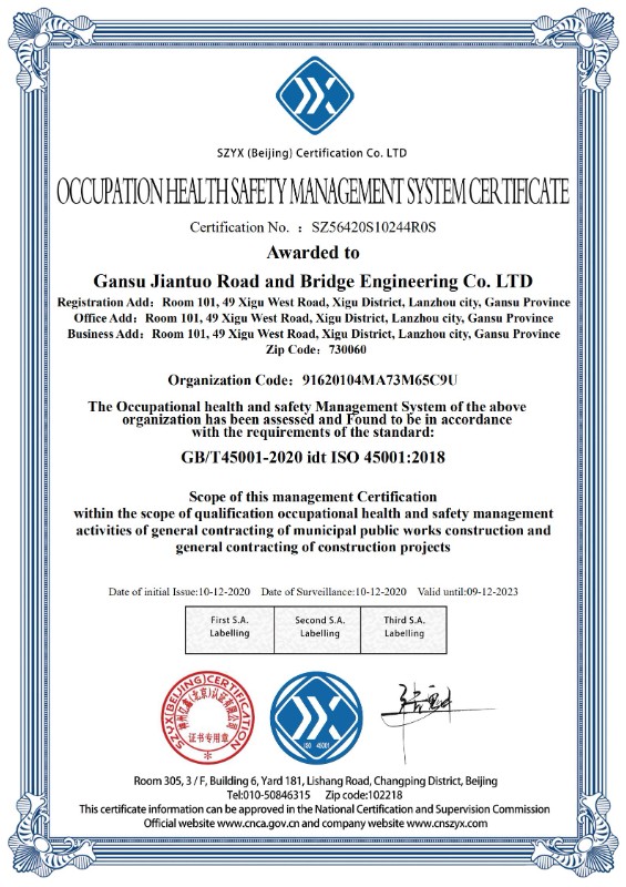 職業(yè)健康安全管理體系認證證書