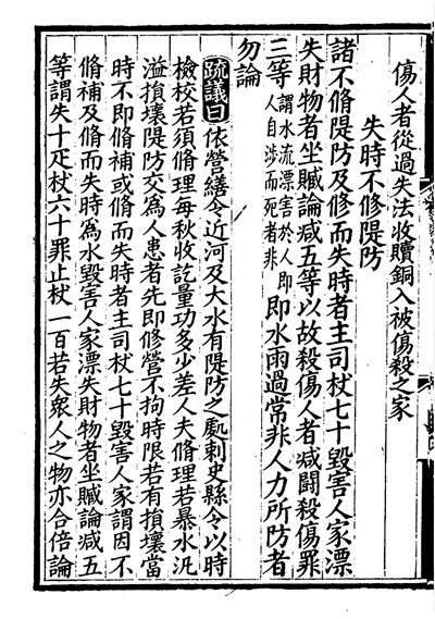 《唐律疏議》是中國歷史上迄今保存下來的最完整、最早的古代成文法典。其《雜律》第424條規(guī)定:“諸不修堤防及修而失時者,主司杖七十”“諸盜決堤防者,杖一百”“其故決堤防者,徒三年”,將不修堤防、盜決堤防列入法定罪行。