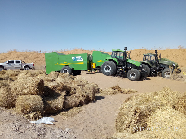 東方欲曉,曙光乍現(xiàn)。每一天當(dāng)魚(yú)肚白淺與淺藍(lán)交匯之際,睡在帳篷里的我們?cè)诎l(fā)電機(jī)的隆隆聲中睜開(kāi)惺忪的睡眼,簡(jiǎn)單地吃過(guò)早飯,開(kāi)始一天的工作。清晨的沙漠雖然有太陽(yáng)散射的萬(wàn)丈光芒,但襲人的瑟瑟寒氣讓我們直打哆嗦,為了方便作業(yè)、提高效率,我們輕裝上陣。往固沙機(jī)車(chē)廂里裝接草簾子是工作的開(kāi)始,這一環(huán)節(jié)是最基礎(chǔ)的一步,也是最關(guān)鍵的一步,當(dāng)然也是最臟最累的工序。之所以說(shuō)是最關(guān)鍵的一步是因?yàn)檐?chē)廂內(nèi)的草簾子是由每一卷長(zhǎng)12米左右的草簾子首尾相連依次串聯(lián)起來(lái)的,盡可能地不能出現(xiàn)接錯(cuò)的情況,一旦出現(xiàn)就會(huì)直接影響固沙機(jī)壓草方格的效率,因此我們?cè)诜€(wěn)中求快,以提高整體的工作效率。