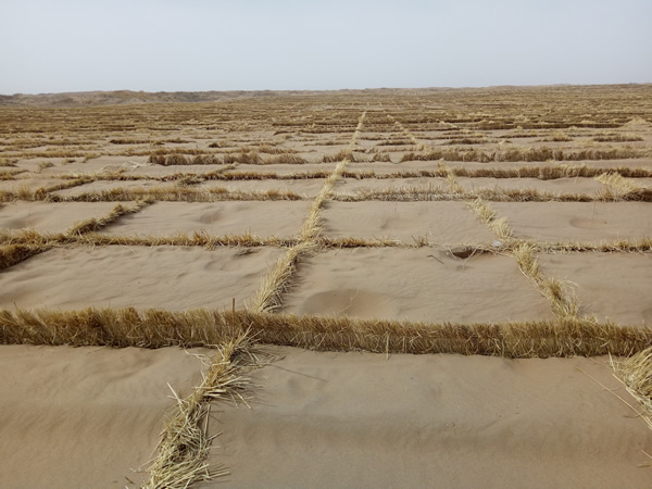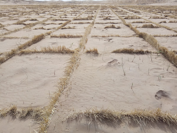 草簾子里的塵土大、沙粒多、碎草屑多,連續(xù)作業(yè)大半天,整個(gè)人全被塵埃和草屑所包裹,尤其是鼻孔里和耳朵里,滿(mǎn)滿(mǎn)的灰塵,縱然有口罩、帽子的庇護(hù),還是如此。用細(xì)扎絲連接草簾子,每一天數(shù)百捆的草簾子和扎絲需要經(jīng)過(guò)雙手,手套不知磨破了多少雙,手指頭的皮膚皸裂了,長(zhǎng)滿(mǎn)倒刺,剝了一層又一層,又干又脹。遇到大風(fēng),眼睛被沙粒和草屑吹迷,不過(guò)好在公司為我們及時(shí)配備了防護(hù)鏡,戴上之后有了極大的改善。條件雖然艱苦,工作雖然苦累,可是每每看著一塊塊麥草方格屹立在沙漠中,阻擋著風(fēng)沙的肆意蔓延時(shí),大伙的臉上便會(huì)露出些許欣慰的笑容。